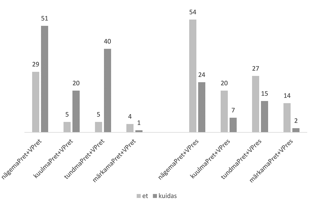 Otsisin etTenTen’i korpusest lauseid, milles lihtminevikulisele tajuverbile nägema, kuulma, tundma, märkama järgneb vahetult sidend et või kuidas, ning leidsin minevikulisi kõrvallauseid 155 korral (verbiga nägema 80, kuulma 25, tundma 45, märkama 5). Neist 43 korral esines sidend et (vastavalt: nägema 29, kuulma 5, tundma 5, märkama 4) ja 112 korral kuidas (nägema 51, kuulma 20, tundma 40, märkama 1). Olevikulisi kõrvallauseid oli 163 korral (pärast verbi nägema 78, kuulma 27, tundma 42, märkama 16), neist 115 juhul esines sidend et (nägema 54, kuulma 20, tundma 27, märkama 14) ja 48 korral kuidas (nägema 24, kuulma 7, tundma 15, märkama 2). Päringu tulemused on koondatud joonisele 1.