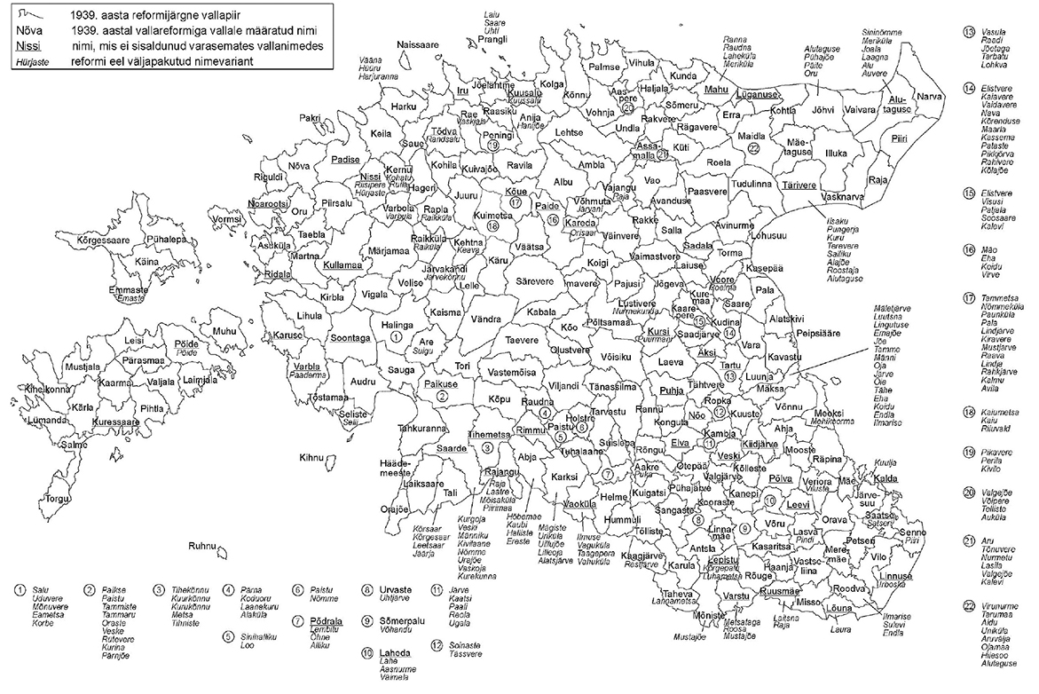 1939. aastal läbiviidud valdade reformi tulemusel tekkinud 248 vallast said 52 endale täiesti uue nime ehk sellise, mis ei sisaldunud ega olnud tuletatud ühinenud valdade nimedest. Neist 16 valda nimetati kunagise kihelkonna järgi, mille Kohanimede Nõukogu tunnistas ajaloolise nimena vastuvõetavaks.