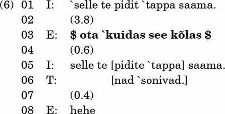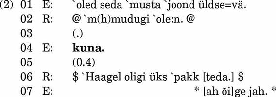 E küsib aja järele küsisõnaga kuna (rida 4). Siin on küsija saanud vormistada infosoovi pelgalt küsisõnaga, sest kuna küsib infot vahetult eelneva vooru kohta ja suhtluses kehtib norm, et vestlejad reageerivad eelnevale voorule (vt Schegloff 2007). Näites 1 järgneb küsimuse esile kutsunud voorule veel paus ja paar vooru (rida 3 ja 4), seetõttu jäänuks pelgalt fraasiga vormistatud küsimus ebaselgeks.