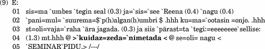E jutustab sõbrannadele, et tema töökohal korraldati üritus. Ta püüab üritust kuidagi kategoriseerida (read 3–4), ent ei oska sellele nime anda. Seepeale hakkab ta sõna otsima, algatades paranduse sõnalõpu venituse (`tegi:), üneemi (eeeeeeee) ja pika, 1,3-sekundilise pausi abil. Seejärel eksplitseerib E real 4 sõnaotsimise, esitades küsilause kuidas seda nimetada, ning hakkab kohe, ilma teiste vastust ootamata, ise selgitama: se oli nagu seminarpidu. Kuna keegi E vestluspartneritest ei tea sellest üritusest midagi, ei saa nad teda vastuse leidmisel aidata. See tõestab, et küsimus on suunatud endale.
