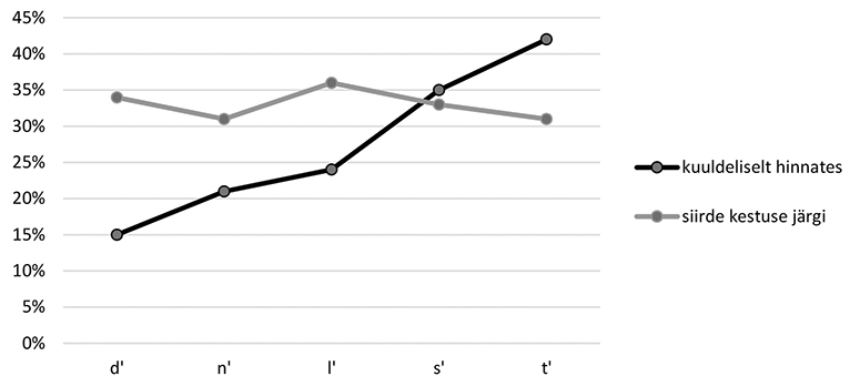 Lõpukonsonandist ei sõltu oluliselt, kas siirde kestuse põhjal määratakse sõna palataliseerituks või mitte (vt joonist 3). Kõigist konsonantidest määrati umbes kolmandik (31–36%) siirde kestust arvestades palataliseerituks. Kuuldeliselt palatalisatsiooni määrates on erinevused suuremad ja seetõttu analüüsimegi konsonantidega seoses sel viisil saadud andmeid.