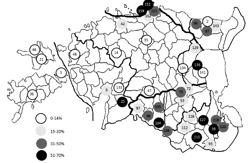 Kaart 1. ĺ, n, s,t´ ja d´ hääldusjuhtude osakaal keelejuhiti (tähistatud ringide ja neis keelejuhile osutava numbriga) vastavalt nende päritolukihelkonnale.
