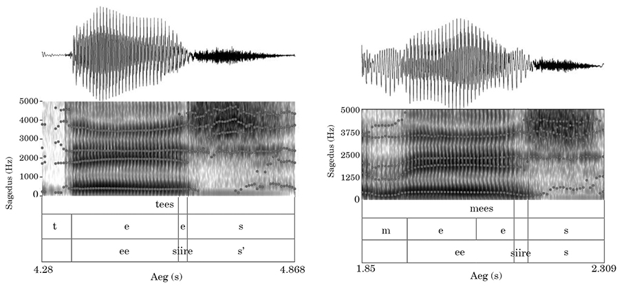 Joonis 2. Sihtsõna tees ja kontrollsõna mees meeskeelejuhi (72) hääldatuna.