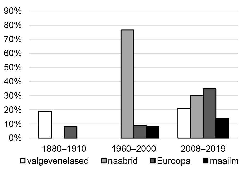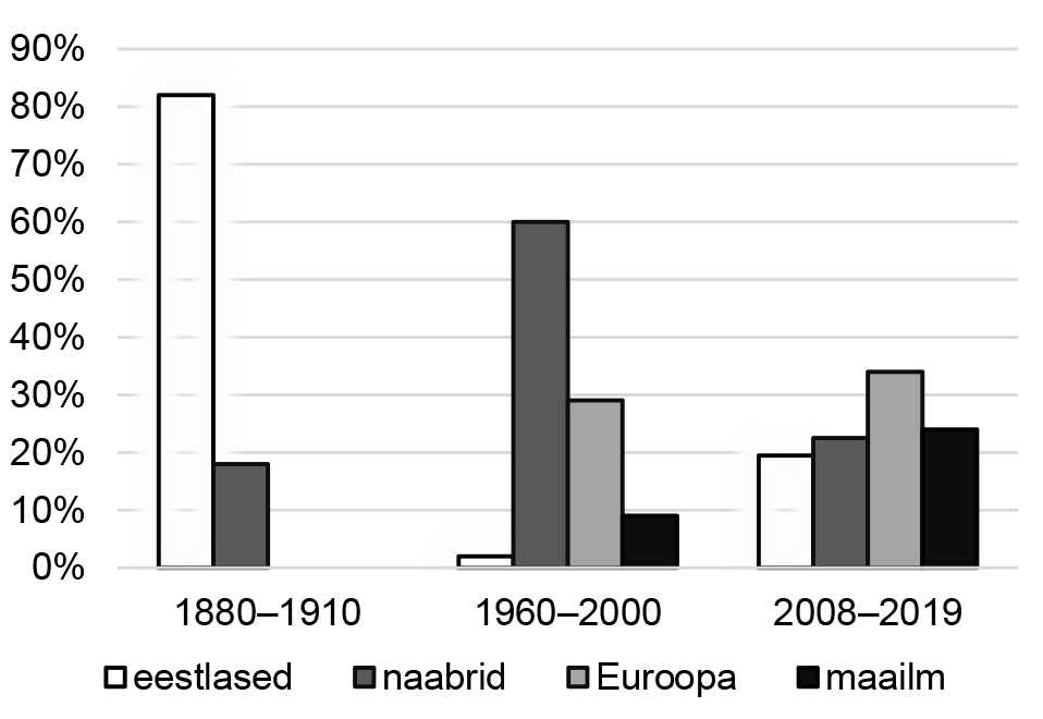 Diakrooniline vaade eesti ja valgevene andmestikule osutab, et etniliste naljade sihtmärk valitakse aina kaugemalt: XIX sajandi lõpu ja XX sajandi alguse geograafiliselt lähedased sihtmärgid (eestlastele mulgid, setud, hiidlased, vt ka Remmel 2003; valgevenelastele мужык ’kohalik mees’, маскаль ’moskoviit’ jm) asendusid aja jooksul lähimate naabritega (venelased, seda eriti üleliidulises kontekstis) ja Euroopa rahvastega (nt kolme rahva naljades). Praeguseks on kohalikke naljategelasi vähem ja erinevate, geograafiliselt kaugemate etniliste tegelaste arv on kasvanud nii Eestis kui ka Valgevenes (vt Laineste, Fiadotava 2017). Oleme varem osutanud, et viimastel aastakümnetel on taas populaarseks saanud nõukogudeaegne naljatraditsioon ja näiteks Eestis on uuesti tekkinud huvi kohalike sihtmärkide ja enese pihta suunatud huumori vastu (Laineste, Fiadotava 2017: 106) ning Valgevenes on suurenenud huvi venelasi pilavate naljade vastu (mis võib olla paiguti enesekohane). Olles täiendanud tulemusi uusima materjaliga, peame käesolevas artiklis tõdema, et pigem on kasvav osakaal kaugemate sihtmärkide („Euroopa” ja „maailm”) lõikes, samal ajal kui kohalikud tegelased ei esine naljades enam nii aktiivselt (vt graafikuid 1 ja 2).
