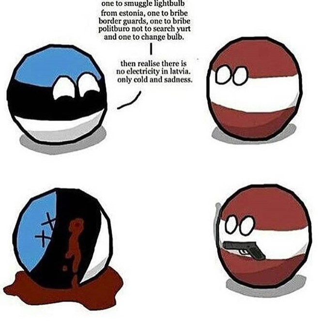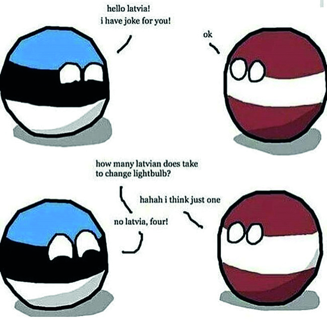 (10) ’Tere, Läti! / Mul on sinu jaoks üks nali. // Ok // Kui palju lätlasi on vaja, et lambipirni vahetada? // Haha, ma arvan, et ainult ühte. // Ei, Läti, nelja! / Üks smugeldab Eestist lambipirni, üks annab piirivalvuritele altkäemaksu, üks maksab poliitbüroole, et see jurtat läbi ei otsiks, ja üks vahetab pirni. / Aga siis nad mõistavad, et Lätis pole elektrit. Ainult külm ja pime. // [Läti laseb Eesti maha]’ (Picbear: @_switzerland_ball, 18. III 2018)