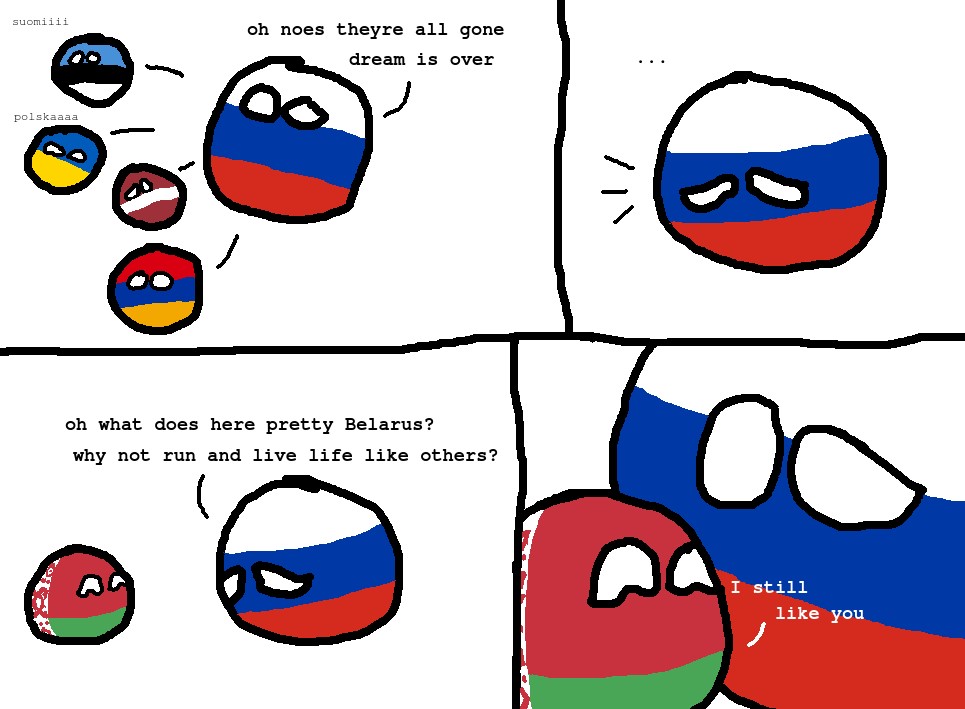 (11) ’Oh ei, nad on kõik läinud / unistus on läbi // … // Oi, mida teeb siin ilus Valgevene? / Miks mitte joosta minema ja elada oma elu nagu teised? // Sa meeldid mulle ikka veel’ (Polandball, 23. VII 2018)