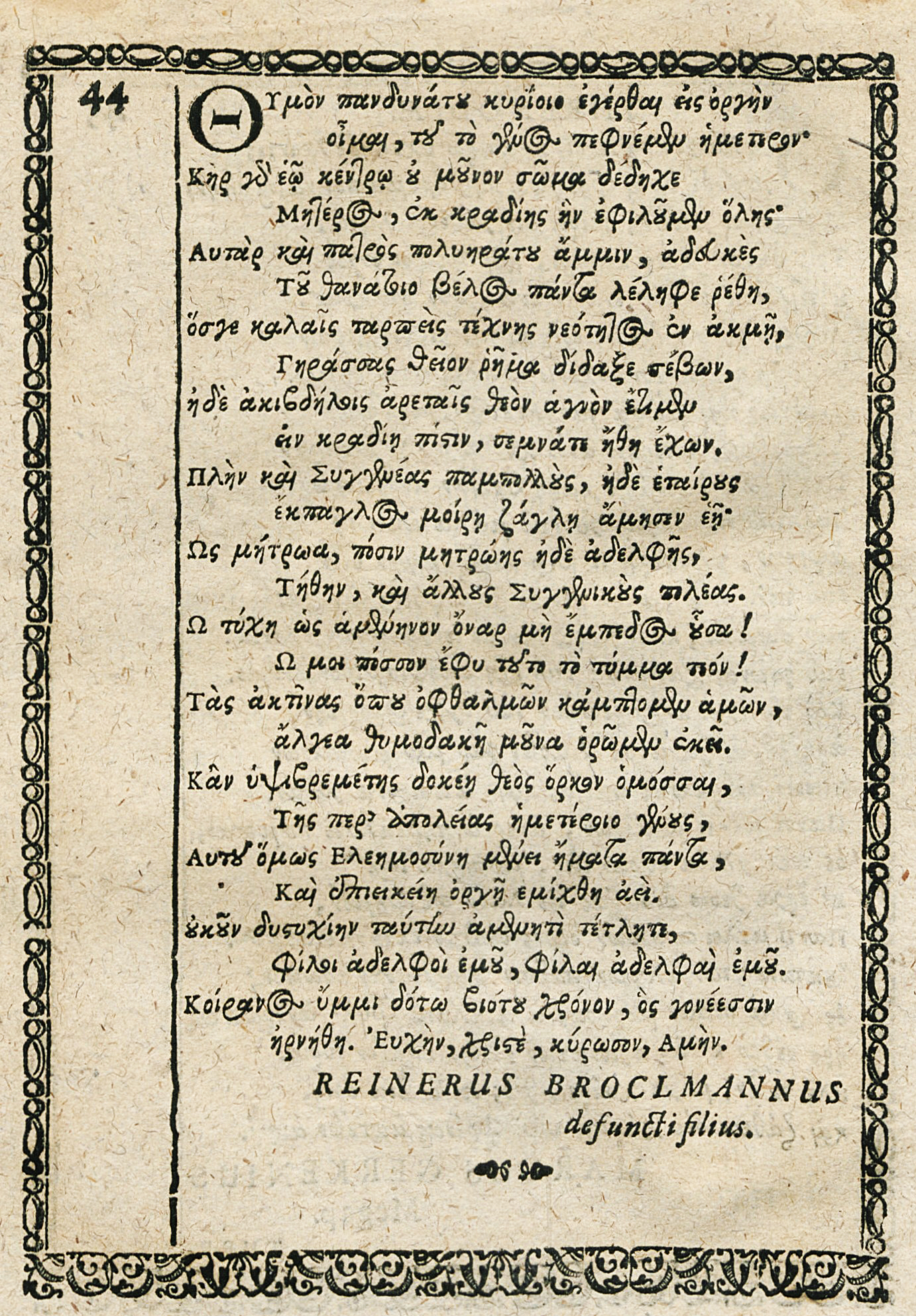 17-aastase poja Brockmanni luuletus isa matusetrükises on vanakreeka keeles 26-realine eleegilises distihhonis poees, millest esimene värss on heksameeter ja teine pentameeter (pilt 1). Minu palvel tõlkis dotsent Marianne Wifstrand Schiebe Uppsalast luuletuse lahkelt vanakreeka keelest rootsi keelde. Allpool järgneb minu vaba eestikeelne tõlge eelmainitud tõlkest.