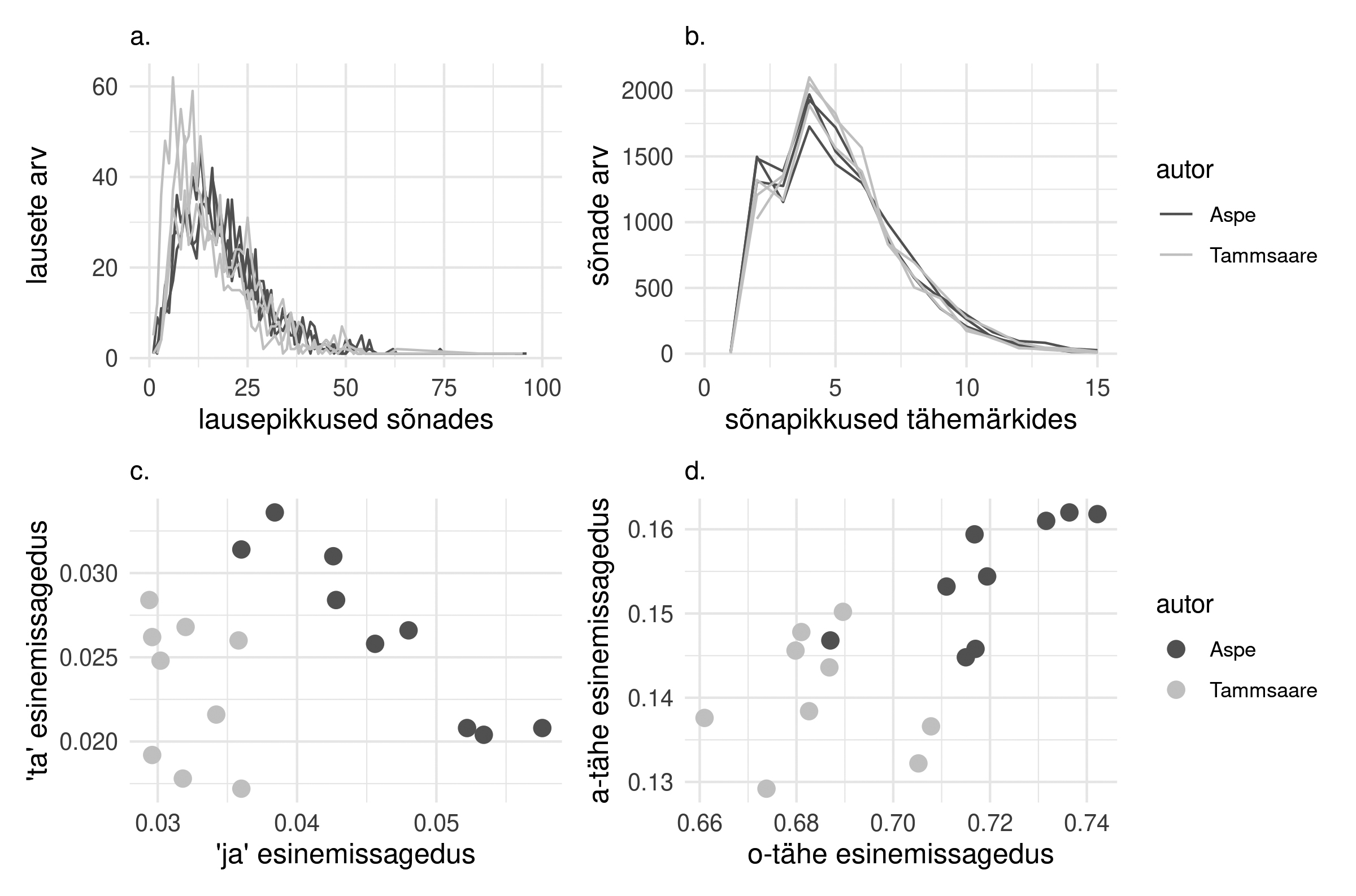 Joonis 1. a. Lausepikkuste jaotus 800-lauselistes näidistes, mis on valitud juhuslikult kolmest Aspe ja kolmest Tammsaare tekstist. b. Sõnapikkuste jaotus 800-lauselistes näidistes, mis on valitud juhuslikult kolmest Aspe ja kolmest Tammsaare tekstist. c. Kahe kõige sagedasema sõna suhteline sagedus 5000-sõnalistes näidistes, mis on juhuslikult valitud kolmest Aspe ja kolmest Tammsaare tekstist. Igast tekstist on võetud kolm näidist. d. Tähtede a ja o sagedus sõnade arvu suhtes 5000-sõnalistes näidistes, mis on juhuslikult valitud kolmest Aspe ja kolmest Tammsaare tekstist. Igast tektsist on võetud kolm näidist.