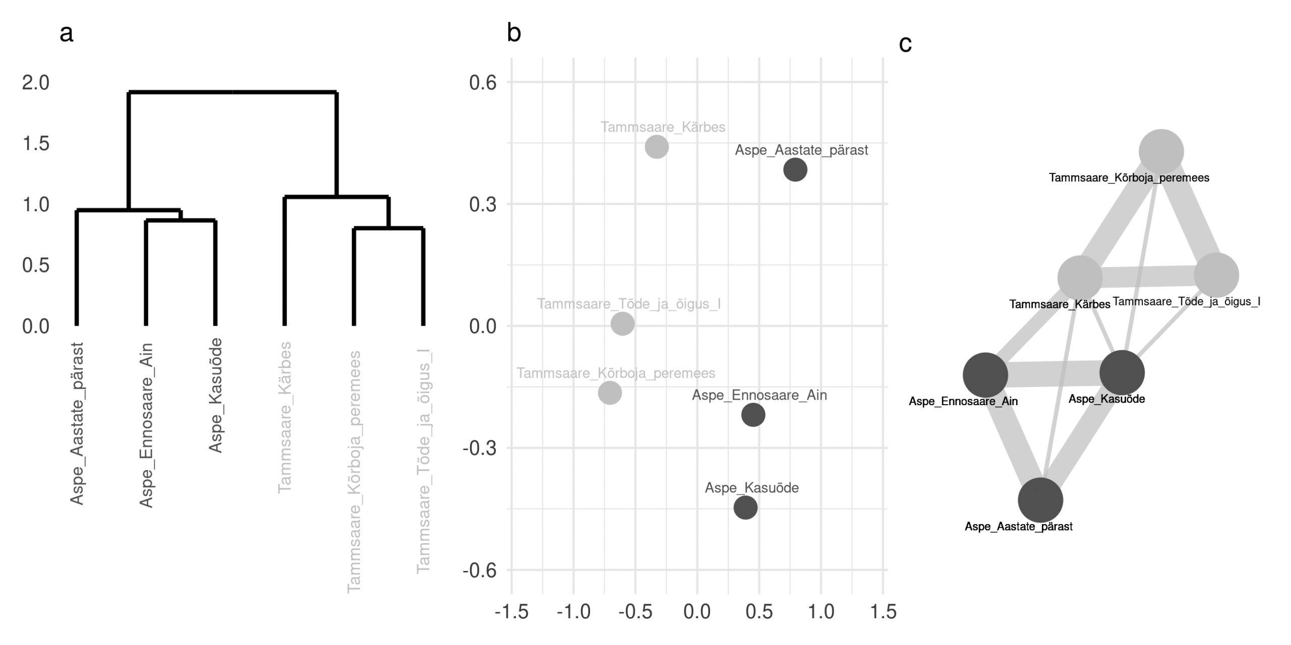 Joonis 4. Kolm näidet kaugussuhete analüüsi ja visualiseerimise meetodite kohta. a. Hierarhilisel klasterdamisel põhinev dendrogramm; Wardi meetod klastrite ühendamiseks. b. Esialgse maatriksi mitmemõõtmeline skaleerimine, peakoordinaatide analüüs (Principal Coordinate Analysis, PCoA). c. Iga teksti kolme lähima naabri põhjal moodustatud võrgustik. Joonte paksus väljendab sarnasuse määra.