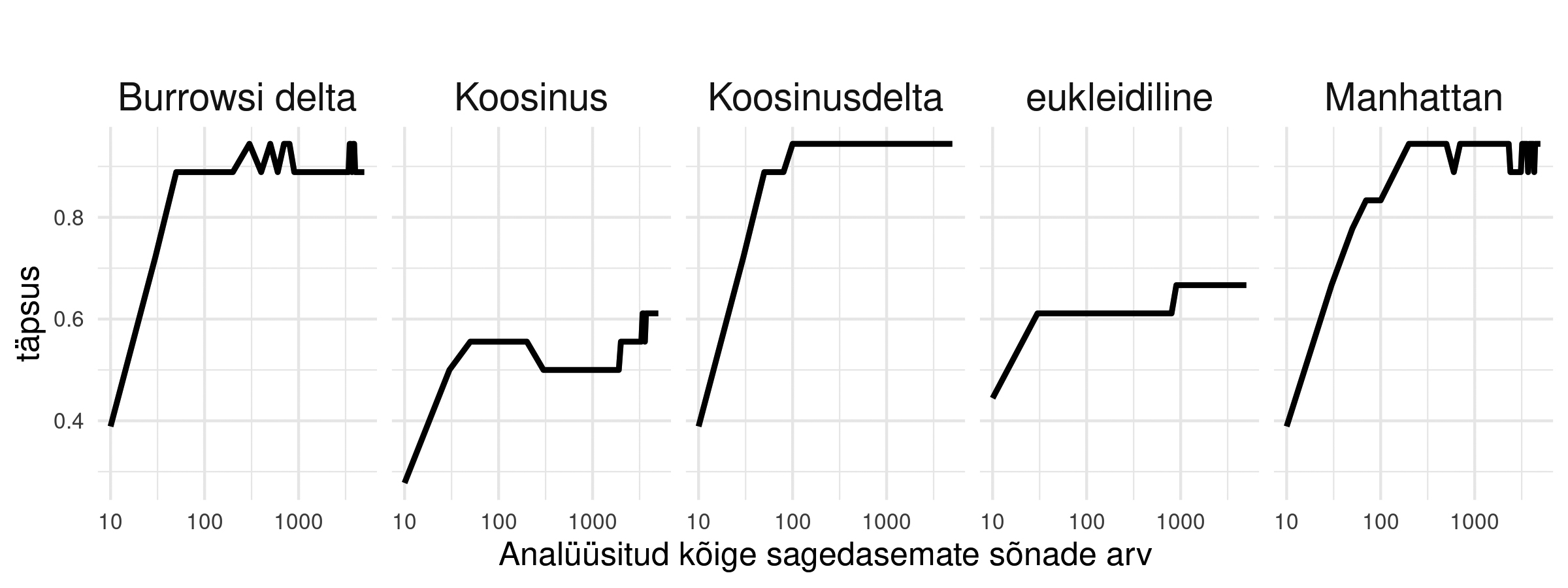 Joonis 5. Kaugusepõhine ristvalideerimine kõige sagedasemate sõnade arvu alusel (10–5000). Kõige sagedasemate sõnade skaala on logaritmiline, et näidata täpsuse järsku hüpet, mis leiab aset 50 ja 100 kõige sagedasema sõna vahel.