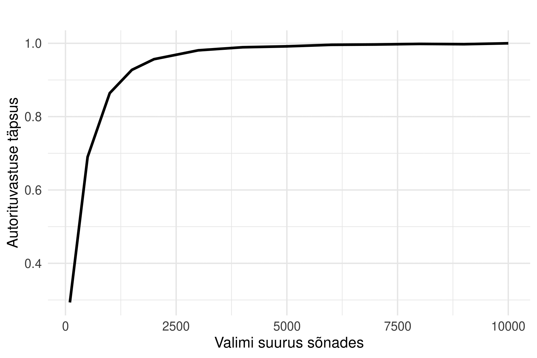 Kuna nüüdseks on teada, et koosinusdelta töökindlus on väga stabiilne, kui kõige sagedasemate sõnade arv > 100, kasutasin seda kaugusetüüpi 200 kõige sagedasema sõnaga, et viia läbi katse näidisemahtudega. Selle asemel et esitada teksti kõigi saada olevate sõnade kujul, esitasin iga teksti sellest juhuslikult valitud sõnade v a l i m i n a. Valimi suurus oli katsekorra piires iga teksti puhul sama, nii et kõik arvutused viidi läbi võrdse suuruse valimiga. Iga suuruse juures (alates sajast kuni kümne tuhande sõnani) võtsin igast tekstist välja sada sõltumatut valimit ning arvutasin iga kord tuvastuse täpsuse. Joonisel 6 võib näha kõverat, mis väljendab lõplikku keskmist täpsust k õ i g i v a l i m i s u u r u s t e k o r r a l.