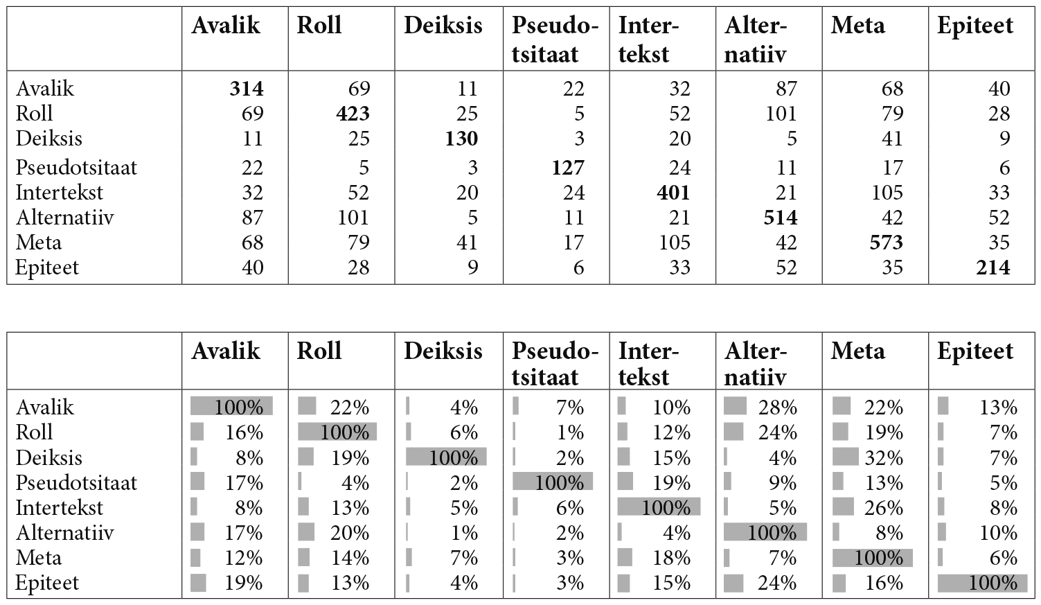 Enim esines meta- ja alternatiivtähenduse kategooria tunnustega tsitaate (vastavalt 30,9% ja 27,7%). Kõige vähem oli deiksise ja pseudotsitaadi tunnustega näiteid (vastavalt 7% ja 6,8%). Rolli kategooria tuvastati 22,8%, intertekst 21,6%, avalik diskursus 16,9% ja epiteet 11,5% juhtudest.