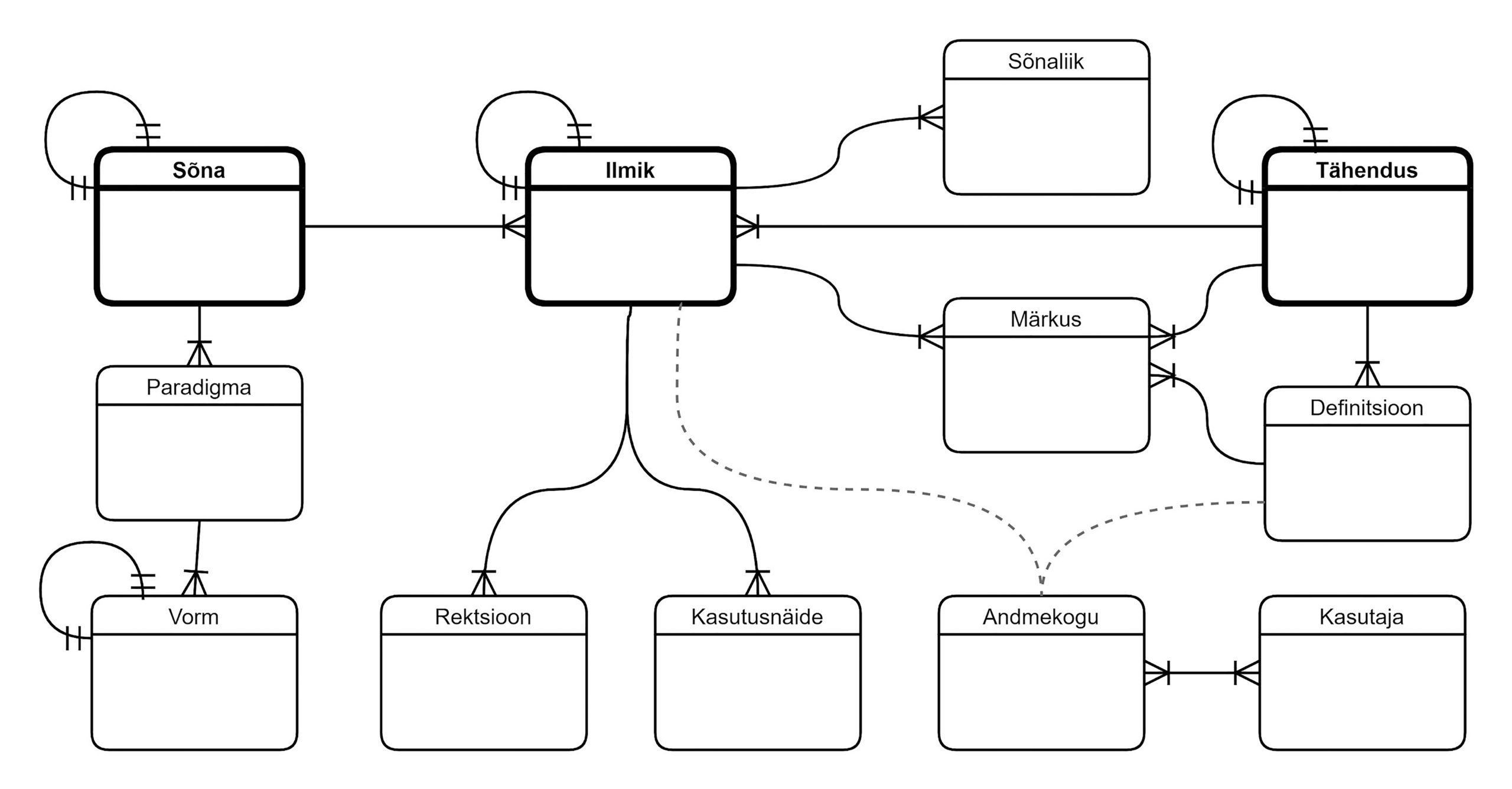 Andmemudelis nimetame seda mitu mitmele seosega olemit lekseemiks, mis lahtiseletatult tähendab ’see sõna selles tähenduses’ (seos sõna ja tähenduse vahel; joonisel 1 tähistab seda seos sõnast tähenduseni). Kui algul oli see pelgalt tehniline seos, siis arenduse käigus on sellest seosest saanud andmemudeli võtmeüksus, mis omakorda seob teisi olemeid: enamik andmeüksusi (nt sõnaliik, rektsioon, õppekommentaarid, kasutusnäited) on lekseemi parameetrid (vt joonist 1).7