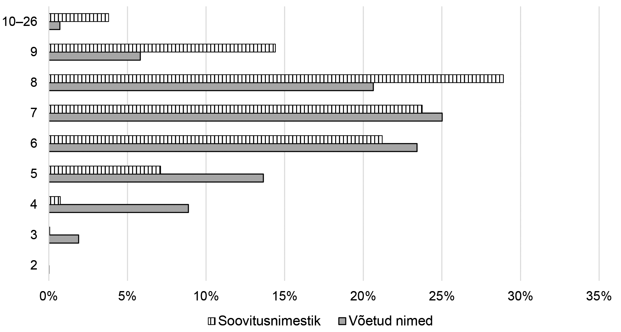 1935. aastal ilmunud soovitusnimestikus „Eesti nimi” leiduvate nimede võrdlus sellest ajast alates kasutusele võetud nimedega näitab nimestiku massilist kasutust, mis aasta-aastalt suurenes, erinedes samas omavalitsuseti, ulatudes 83 protsendini Petserimaal Kalda vallas. Uueks nimeks võetud nimede koondvalikust 30,5% kattus soovitusnimestiku nimedega, olles sageli, kuid kindlasti mitte alati, ka sealt võetud. Muutmiskordi arvestades võeti nimi nimestikust lausa 37%-l kordadest. Nimestikus välja pakutud 15 595 nimest võeti kasutusele 30,2%, eelistades seal välja pakutud keskmisega (7,3 tähte) võrreldes lühemaid nimesid (6,9 tähte) ning välja pakutuga võrreldes suhteliselt rohkem r– ja l-algulisi. Absoluutarvu poolest olid esikohal k-algulised nii välja pakutute kui ka võetute hulgas.