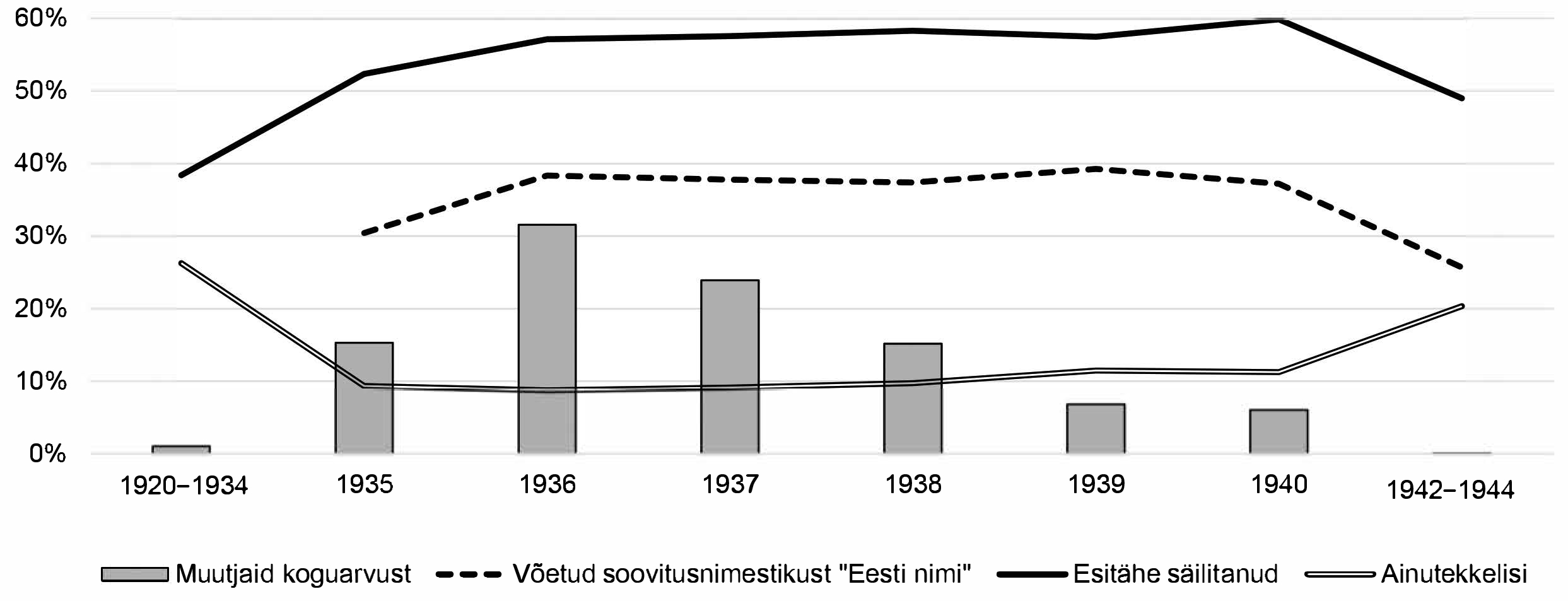 Tabelis 1 on toodud eelnimetatud arvutused ning võrdlusandmed kaasaegse statistikaga. Autoril on õnnestunud leida vaid üks, Edgar Rajandi koostatud mustanddokument 1940. aasta kevadest, kus on toodud andmed 1939. aasta lõpuni ning seda nii sooviavalduste kui ka otsuste kohta.9 Andmed pole aastati küll täpselt võrreldavad, sest otsused avaldati RTL-is viivitusega ning andmebaasis on avaldamise kuupäev. Andmeridu on seega kolm: sooviavaldused, otsused ning otsuste avaldamised. Erinevus arvutusliku ja tegeliku tulemuse vahel perioodi 1920–1934 kohta on selgitatav sellega, et arvutuslikust tulemusest on välja jäetud rööpnimede kaotamise otsused, mis mõjutavad selle perioodi lõpptulemust oluliselt. Aastail 1935–1936 on näha sooviavalduste palju suurem hulk võrreldes muutmisotsustega ning on loomulik, et just sel põhjusel kasutati avalikkuses neist esimest arvu argumendina kõhklejate ärgitamiseks. Alles hiljem hakati avaldama tõepärasemat otsuste statistikat. Siiski jätkus isikute arvu saamiseks otsuste üldarvu korrutamine 2,5-ga.