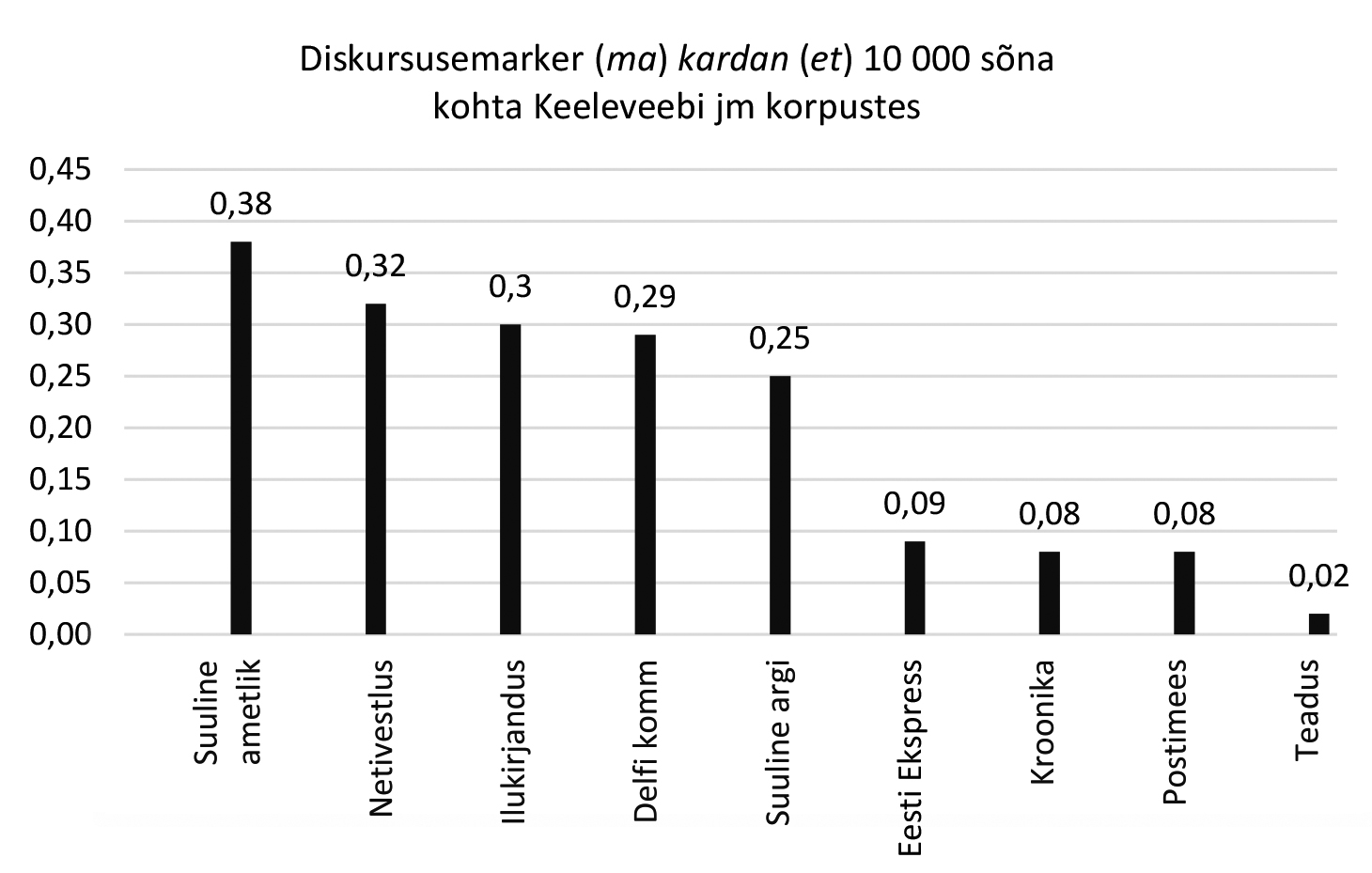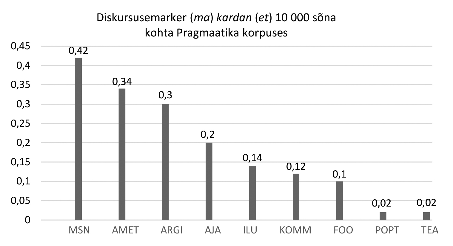 AJA = ajakirjandus; AMET = institutsionaalne suhtlus; ARGI = argivestlus; FOO = foorumid; ILU = ilukirjandus; KOMM = kommentaarid; NETI = netivestlus; PM = postimees; POPT = populaarteadus; TEA = teadus.