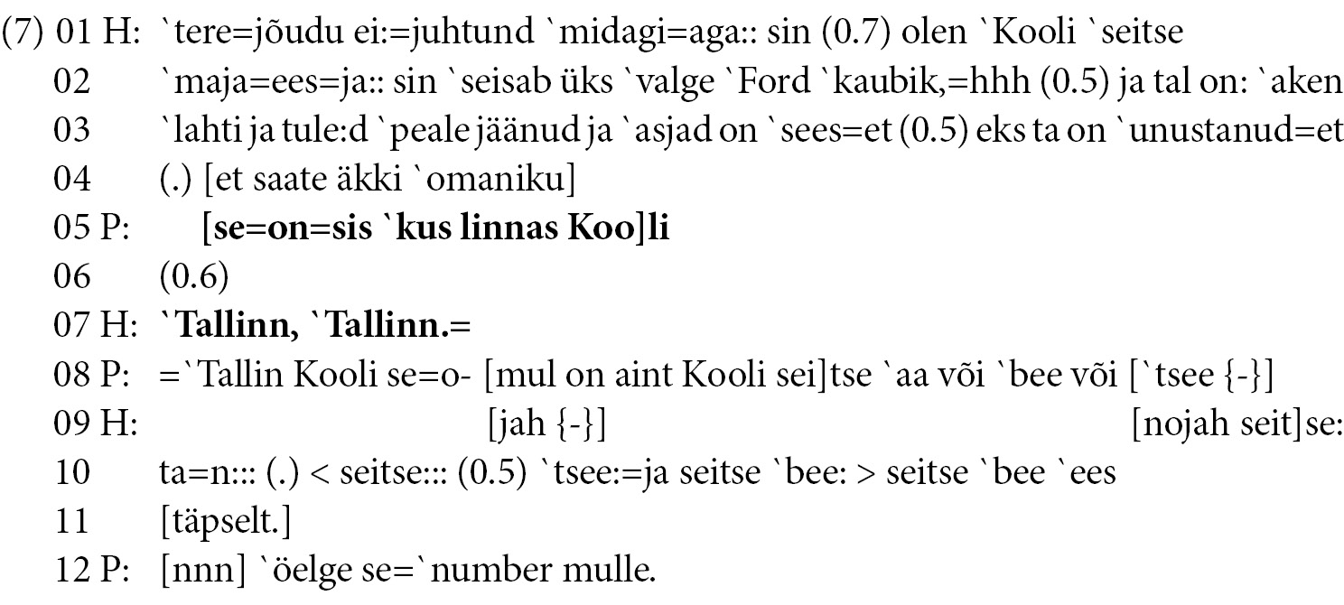 Päästekorraldaja esitab helistajale mitu kohaküsimust (read 1, 6, 12), millega saab helistajalt teada, et abi läheb tarvis Kabala vallas Alutaguse külas Mesika tänaval (read 4 ja 13), ja markeerib seda partikliga nii (rida 14), mille venitatud vokaal viitab sellele, et päästekorraldaja vajab aega samal ajal millegi muuga tegelemiseks (Hennoste 2000a: 2037–2038; vt ka Keevallik 2010). Järgmises voorus küsib päästekorraldaja helistajalt üle külanime, mille õigsust helistaja kinnitab (read 16 ja 18). Peale 2,4-sekundilist pausi väljendab päästekorraldaja, et saadud infoga on probleeme, viidates lausega uvitav et ei `anna mulle sellist aadressi (rida 20), et tema programmis sellise aadressiga kohta ei ole. Sealjuures on päästekorraldaja voor lausutud vaiksema häälega, mistõttu pole vooru taust üheselt selge. See võib olla nii omaette lausutud kommentaar kui ka võte vabandamaks oma kõnes tekkinud vaikust ja viivitust, mida päästekorraldajad peavad hädaabikõnedes vältima. Seepeale muudab päästekorraldaja teemat (näites mitte toodud), kuid pöördub hiljem kõnes tagasi aadressi kindlakstegemise juurde (rida 21).2 Selle järel toob helistaja omal algatusel välja uue info ja lausub, et tegu on hoopis Arbi külaga (rida 23). Helistaja uut infot sisaldav voor algab ka sisse hingates lausutud partikliga aah, mis väljendab kõneleja üllatust ja info uudsust (Hennoste 2000a: 1779). Helistaja lisab uuele infole ka vabandava põhjenduse varasema valeinfo kohta (read 25–26). Sellega õigustab ta oma eksimust ja lükkab süü endalt ära: lausega need on jälle oma `küla piire `muutnud (rida 25) vastandab helistaja end nendega, kes oma küla piire on muutnud. Helistaja väljendab, et ta ei ole kohaliku kogukonna liige, mistõttu on tema teadmatus nimemuutusest põhjendatud. Päästekorraldaja väljendab partiklitega nii ja vot korrektse aadressi leidmist ning kohaprobleem laheneb.