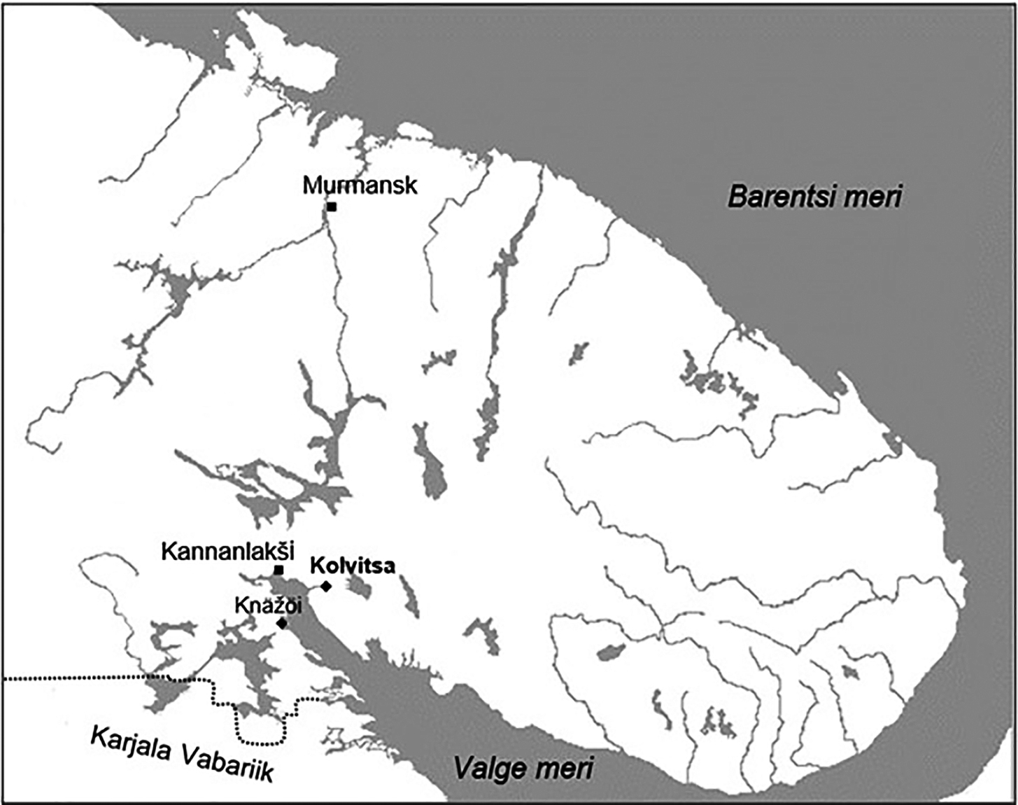 Kaart 1. Kolvitsa küla ja Koola poolsaar. Kolvitsa ümbruse asulad on karjalakeelsete nimedega, ülejäänud kohanimed on eesti keeles.