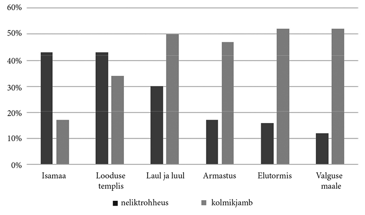 Alltoodud graafik annab ülevaate luule­kogus kahe enim tarvitatud värsimõõdu, nelik­trohheu­se ja kolmikjambi jagunemisest raamatu kuue temaatilise tsükli vahel (andmed esitatud protsentuaalselt).