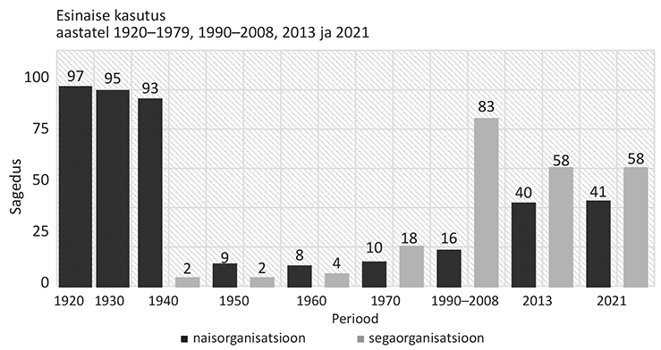 Sõna esinaine kasutuse aastakümnete lõikes võtab kokku joonis 1, millel on kujutatud kas nais- või segaorganisatsiooni juhi tähenduses esinenud kasutuse absoluutarve.