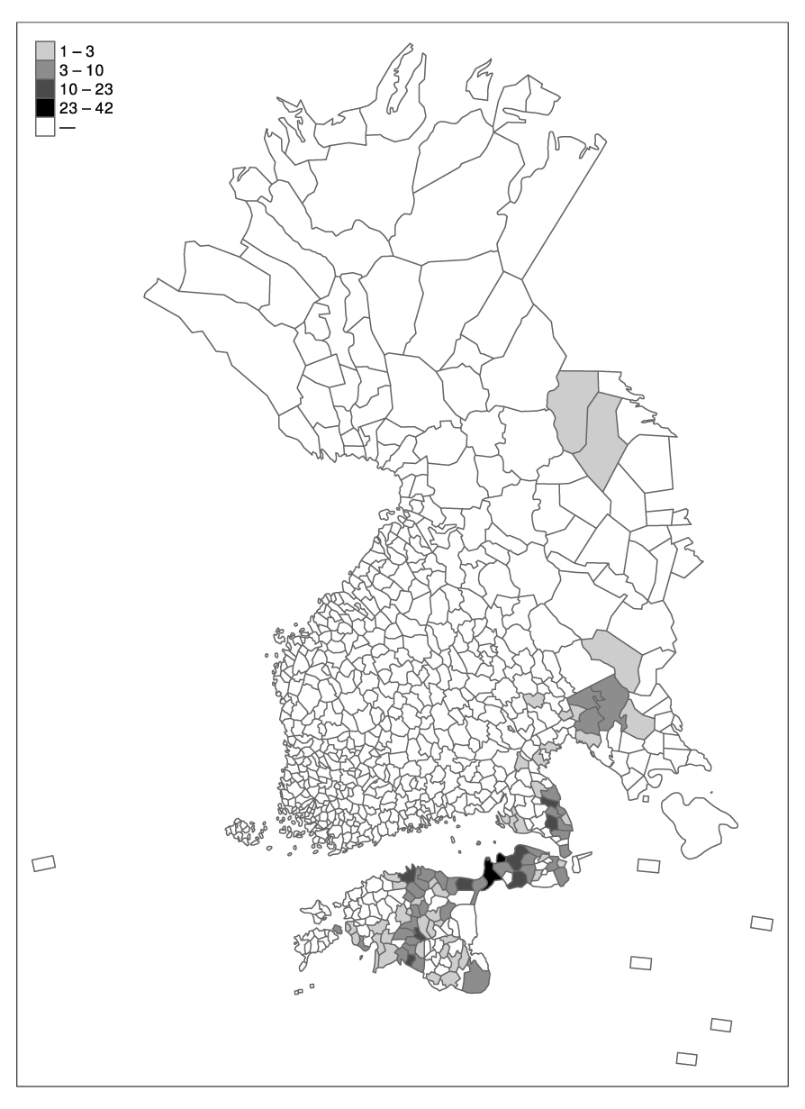 Joonis 1. Laulutüüpidesse „Harja otsimine”, „Suka mereen”, „Mõõk merest”, „Miekka merestä” liigitatud laulude ja nendega sarnaste laulude levikukaart.