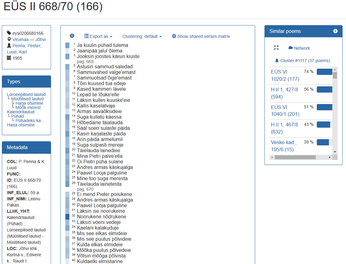 Ühe laulu vaates (joonis 2) näitab Runoregi laulu metaandmeid, teksti ning kõige sarnasemate tekstide loendit, samuti pakub võimaluse uurida tuvastatud sarnaste värsside klastreid (klikkides ruudukesele värsi ees, ruudu tumedus näitab sarnaste värsside arvu), sarnaseid lõike (need ilmuvad, kui valida hiirega huvi pakkuv lõik laulust) ning saada kiire ülevaade, millised laulu värsid esinevad teistes tekstile kõige sarnasemates lauludes (vajutades kirjale: „Show shared verses matrix” ’näita ühiste värsside maatriksit’).