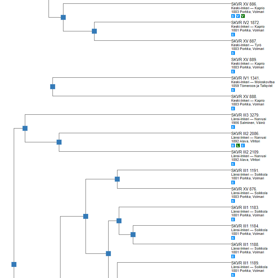 Kui klõpsata laulutüübi nimetusele, siis avaneb lehekülg, kus on tüübikirjeldus (juhul kui see on andmebaasis olemas) ning loend kõigi selle tüübi alla liigitatud laulude andmetega. Loend on järjestatud alfabeetiliselt viite alusel, mis SKVR-i alamkogu puhul tähendab ka algset avaldamise järjekorda. Laulutüübi kohta on võimalik kuvada ka muid ülevaateid: laulude esinemust võib kuvada kaardil, vaadata ülevaatlikku visualisatsiooni uuritava tüübiga kontamineeruvatest laulutüüpidest ning vaadata puu (dendrogrammi, joonis 3) vaates, kuidas tüüpi kuuluvad laulud sarnasuse alusel omavahel rühmituvad. Puu vaadet võib täiendada tüüpi kuuluvate sarnaste lauludega. Nii on võimalik vaatlusse kaasata laulud, millel tüübimääratlus puudub või mis on määratud muudesse tüüpidesse. Puu vaates rühmituvad kokku enamasti lähedastest kohtadest pärit laulud, tuues esile sarnasuse piirkonnatraditsioonide sees. Puu vaate sõlmedele klõpsates on võimalik vaadata kõrvuti lähedasi lauluvariante, mis aitab kiiremini läbi töötada ja lihtsamalt võrrelda sarnaseid tekste.