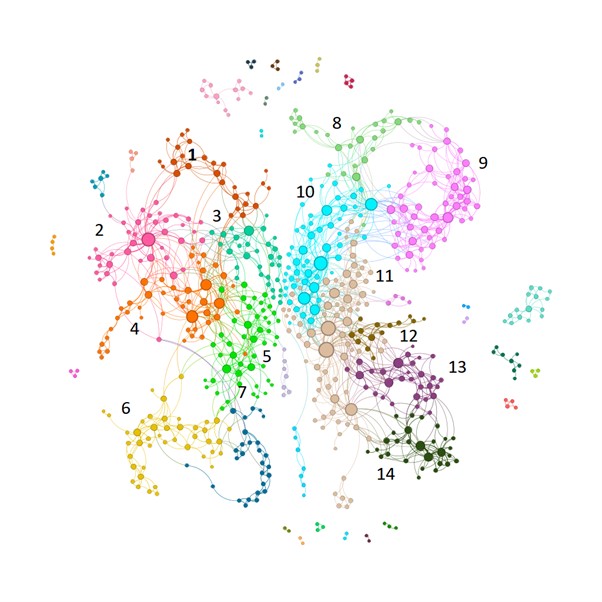 Joonisel 4 on esitatud kammi kaotamisega seotud laulude värsiklastrite külgnevusseoste graaf.9 Graafi iga sõlm esindab ühte värsiklastrit ning graafile on valitud kõik värsiklastrite paarid, mis tekstis esinevad üle ühe korra kas kõrvuti või teineteisest ühe värsi kaugusel. Seose olulisust näitab sõlmedevahelise joone jämedus, mille aluseks on seosetihedushinnang.10 Võrgustikus ilmnevad omavahel tihedamalt seotud värsiklastrite alagrupid, suuremad alagrupid on joonisel tähistatud numbritega 1–14 ning need viitavad kas piirkondlikele eriarendustele või väiksematele sisuüksustele (motiividele). Alagrupid 1–7 esindavad laulu eesti tekste ning grupid 8–14 Ingerimaa, soome ja karjala tekste. Suuremad sõlmed võrgustikus viitavad laulu kesksetele värssidele, mis esinevad rohkemates lauluvariantides ja külgnevad rohkemate värssidega.