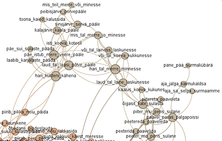 Selleks et vaadata motiivistiku hargnemist läänemeresoome traditsiooni üleselt, viisime käsitsi kokku värsid, mis kuulusid samadesse värsitüüpidesse. Samaks värsitüübiks lugesime värsid, kus sisusõnad olid samade tüvedega (onomatopoeetiliste sõnade puhul ka lähedaste tüvedega: suisahti ~ sulpsatas ~ vulksatas), erineda võisid sõnajärg, grammatilised sõnad, tuletusliited ja morfoloogilised lõpud. Pärast samasse värsitüüpi kuuluvate värsiklastrite kokkuviimist arvutasime uuesti külgnevusnäitajad ja joonistasime uue graafi (joonis 6).