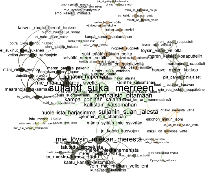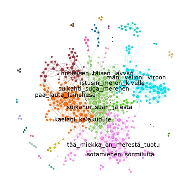 Joonis 4. Laulutüüpide „Harja otsimine”, „Suka mereen”, „Mõõk merest” ja „Miekka merestä” ning neile sarnaste laulude värsiklastrite külgnevusseoste võrgustik (graafil on kuvatud kõik rohkem kui üks kord esinevad seosed rohkem kui kolm korda ette tulevates värsitüüpides). Võrgustiku Gephi modulaarsusanalüüsiga saadud alagrupid on nummerdatud ja võimaluste piires ka eristatud tooniga, sõlme suurus näitab temaga külgnevate teiste värsiklastrite arvu.