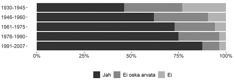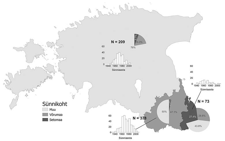 Uurimuse materjal on kogutud 2022. aasta detsembris veebiküsitluse kaudu, mis viidi läbi LimeSurvey keskkonnas. Veebiküsitlust jagati mitmes sotsiaalmeedia grupis, kus osaleb Võrumaalt ja Setomaalt pärit inimesi (nt Võro kiil, Seto kiil, Seto Instituut, VÕRUKAD SUURIM). Kuulutust jagati aktiivselt nii teistesse gruppidesse kui ka üksikinimeste Facebooki lehtedel. Võrreldes varasemate uurimustega oleme kasutanud seega mugavusvalimit, mille pluss on, et see hõlmab ka ajalooliselt asualalt väljarännanuid. Küsitlusse oodati võro ja seto juurtega inimesi – nii neid, kes praegugi neis piirkondades elavad, kui ka neid, kes elavad mujal. Kokku täitis küsimustiku lõpuni 660 inimest. Enamik vastajaid (~60%) oli sündinud aastatel 1960–1980 ning oluliselt rohkem oli vastanute hulgas naisi (84%) kui mehi (16%). Kõige enam (57%) vastuseid tuli inimestelt, kes olid sündinud ajaloolise Võrumaa aladel. Täpsema ülevaate küsimustikule vastanute taustast annavad joonis 1 ja tabel 2. Küsitluse andmed on kättesaadavad avatud teaduse andmevõrgustiku OSF (Open Science Framework) repositooriumis (Lindström jt 2024).
