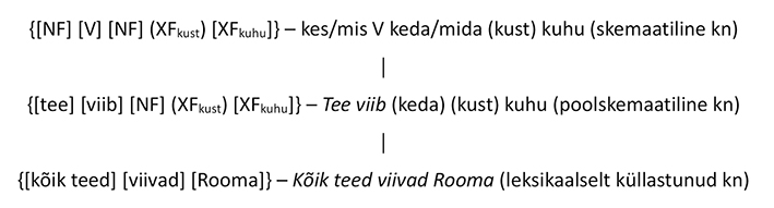 1. täisskemaatiline ehk täielikult lünkadest koosnev abstraktne konstruktsioon, näiteks põhjustatud liikumise argumentstruktuuri konstruktsioon {[NF][V][NF][XFkuhu]}9, mille kasutamist illustreerib lekseemidega täidetud lause Uku viib raamatu riiuli peale;