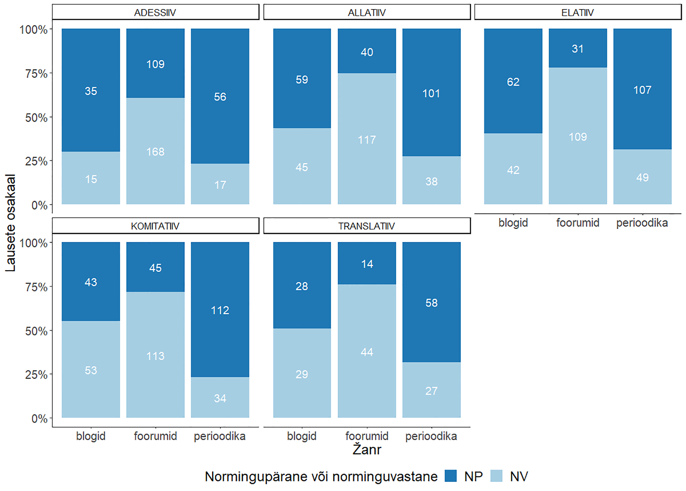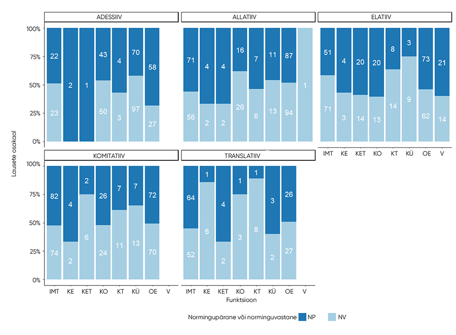 Tabelist 8 on näha, et normingupäraste vormide esinemine on ülekaalus viies funktsioonis: indefiniitpronoomen viitab mittekindlale ja irreaalsele (IMT) või kindlale ja kõnelejale mitteteadaolevale (KET), esineb otsest eitust väljendavas kontekstis (OE), kaudset eitust väljendavas kontekstis (KE) või kontekstis, kus on võrdlus koos võrdlusalusega (V). Norminguvastaste vormide esinemine on ülekaalus kolmes funktsioonis: indefiniitpronoomen esineb kui-konditsionaalsust (KO) või üldküsimust väljendavas kontekstis (KÜ) või viitab kindlale ja kõnelejale teadaolevale (KT). Enim normingupäraseid vorme esineb kontekstis, kus väljendatakse võrdlust koos võrdlusalusega (58,3%), ja enim norminguvastaseid vorme seal, kus viidatakse kindlale ja kõnelejale teadaolevale (60,9%). Hii-ruut-testi tulemus χ2(7, N = 1800) = 15,28, p = 0,03 on statistiliselt oluline ja näitab, et vormide normingupärasus või -vastasus sõltub pronoomeni funktsioonist osalauses. Craméri V on 0,1, mis tähendab nõrka seost. Et hinnata vormide normingupärasuse või -vastasuse sõltumist käändest, visualiseerisin tulpdiagrammiga normingupäraste ja -vastaste käändevormide esinemise sageduse ja osakaalu kõigis uuritavates käänetes (vt joonist 3).