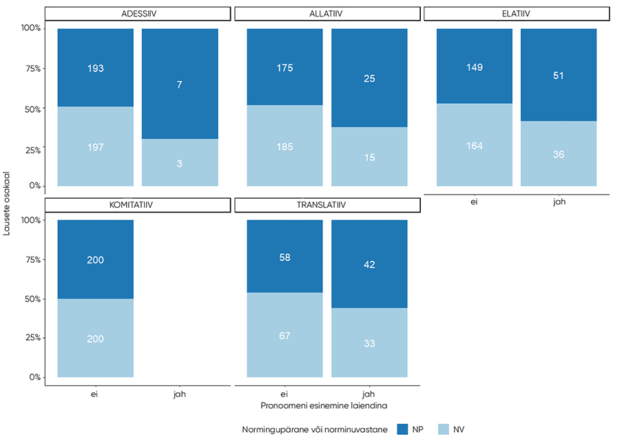 Hii-ruut-testi ja Fisheri täpse testi tulemused näitasid, et käändevormide normingupärane või -vastane kasutus sõltub statistiliselt oluliselt žanrist nii kõigis uuritud käänetes (elatiiv, allatiiv, adessiiv, translatiiv, komitatiiv) eraldi kui ka kõigi käänete peale kokku. Uuritud käänete peale kokku sõltus käändevorm ka pronoomeni esinemisest laiendina ja pronoomeni funktsioonist osalauses. Igat käänet eraldi vaatav analüüs näitas, et vormide kasutus sõltub adessiivis ja translatiivis ka pronoomeni funktsioonist osalauses. Tingimusliku otsustuspuu mudeli järgi on normingupäraste ja -vastaste käändevormide varieerumisega statistiliselt kõige tugevamalt seotud žanr ja sellest tulenevalt ka teksti toimetatus. Blogi- ja perioodikatekstides, mis on enamjaolt või osaliselt toimetatud, on käändevormid tõenäolisemalt normingupärased, ning foorumitekstides, mis on toimetamata, tõenäolisemalt norminguvastased.