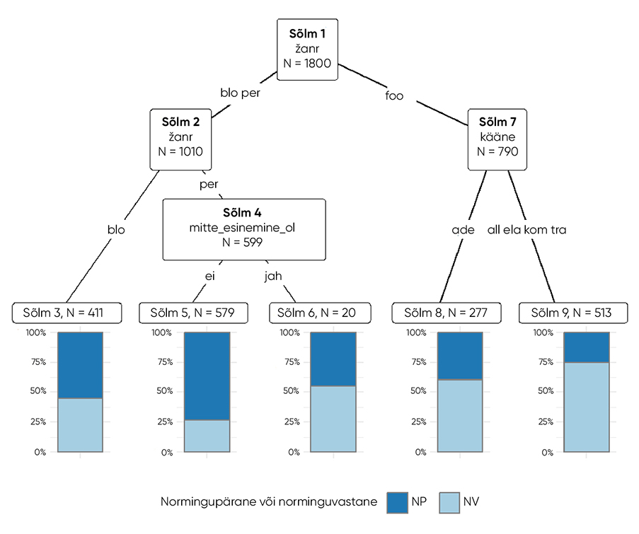 Jooniselt 4 on näha, et normingupäraste ja -vastaste käändevormide varieerumisega on statistiliselt kõige tugevamalt seotud žanr. Selle alusel jagunevad esimeses sõlmes blogid ja perioodika ühte harusse ning foorumid teise harusse. Teises sõlmes jagunevad blogid ja perioodika omakorda žanri alusel eri harudesse, mille järgi käändevormid, mis esinevad blogitekstides (sõlm 3), on pigem normingupärased (55,2%), ning perioodikatekstides (sõlm 4) sõltub vormide normingupärasus või -vastasus sellest, kas samas osalauses esineb eitussõna mitte: kui seda ei esine (sõlm 5), on käändevormid pigem normingupärased (73,4%), ning kui esineb (sõlm 6), on käändevormid pigem norminguvastased (55%). Foorumites sõltub vormide normingupärasus või -vastasus käändest (sõlm 7). Täpsemalt on foorumites kõigi uuritud käänete vormid pigem norminguvastased, kuid erineval määral: adessiivis (sõlm 8) on norminguvastaseid vorme 60,6%, allatiivis, elatiivis, komitatiivis ja translatiivis (sõlm 9) kokku aga 74,7%.