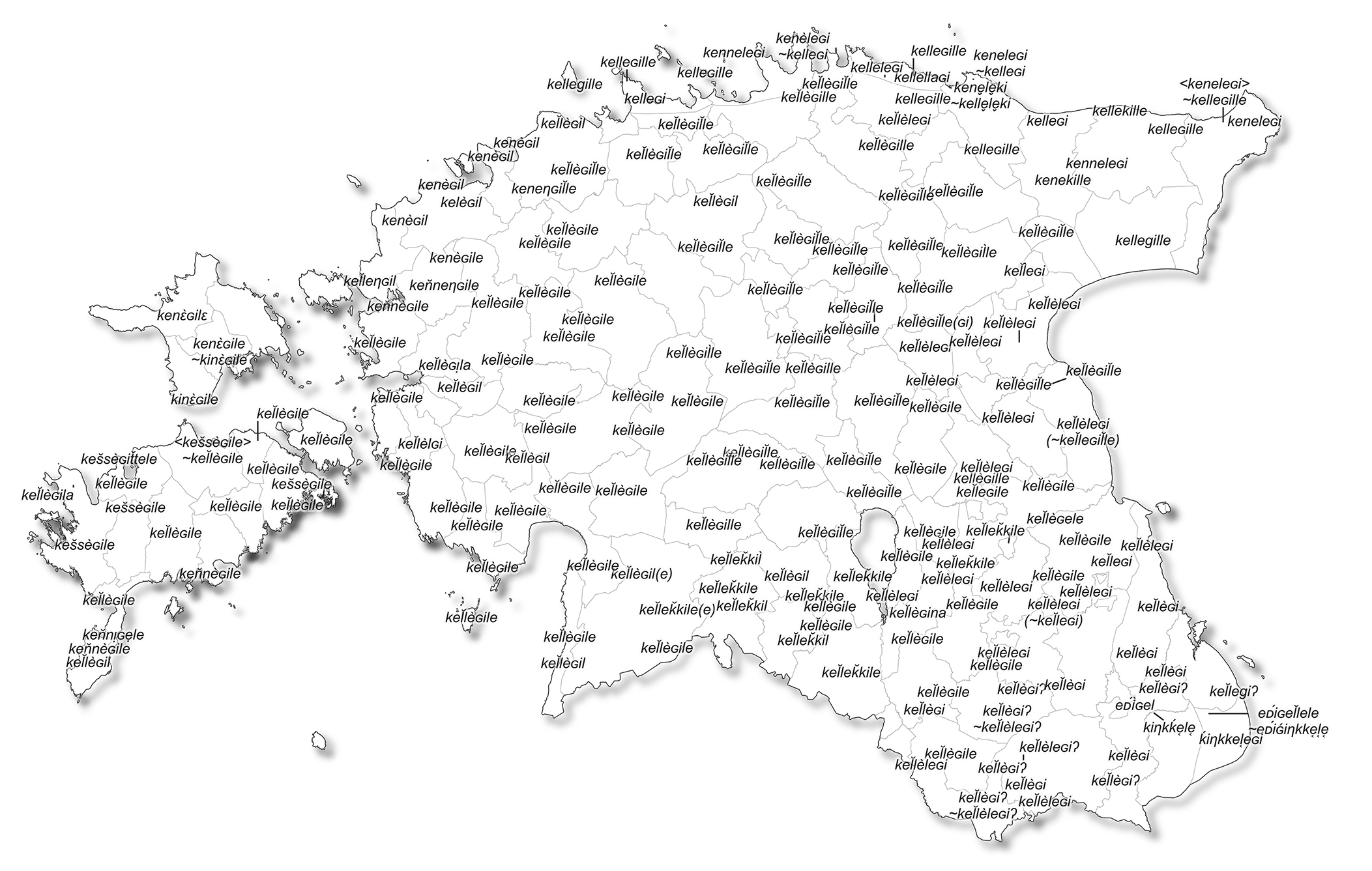 Kaart 1. Pronoomeni keegi allatiivivormide varieerumine murretes Andrus Saareste sõnakaardi põhjal (Saareste 1955: 16).