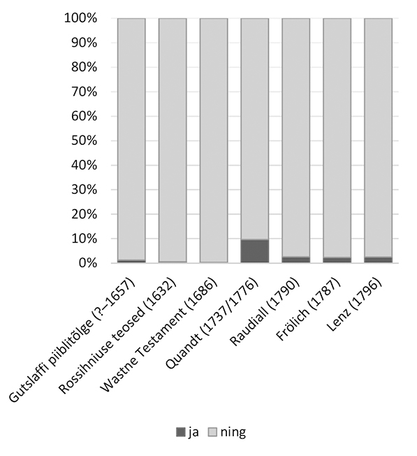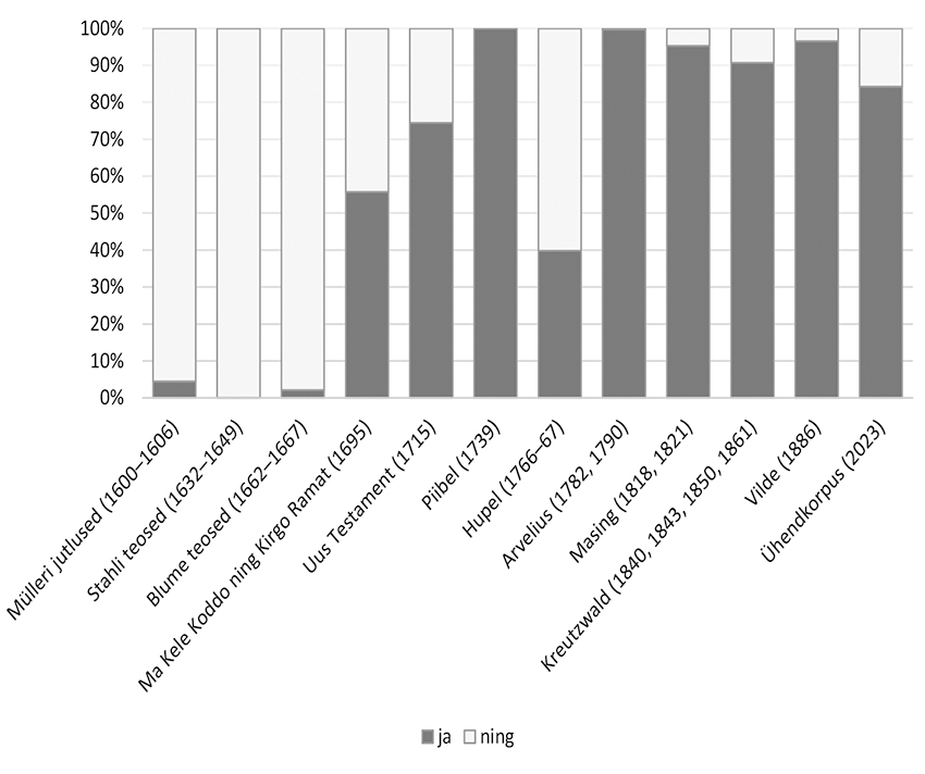 Sidesõnade ning ja ja kasutusest varasemates tekstides annab ülevaate joonis 1, kust on näha, et XVII sajandi autoritest kasutab keelendit ja mõnevõrra Müller, seevastu Stahlil ja Blumel on selle osakaal keelendiga ning võrreldes väga väike. XVIII sajandi usutekstides toimub pööre, kus ja saavutab ülekaalu alates 1715. aasta Uuest Testamendist. 1739. aasta Piiblis on see tõlkijate-toimetajate teadliku ühtlustamise tulemusel juba ülivaldav ja jääb domineerima ka XIX sajandi esimese poole tekstides. Erandlik ja vähesus torkab silma Hupeli tekstides, mis ongi žanriliselt religioossetest tekstidest erinevad (valgustuslikud-õpetlikud) ja säilitanud sellistena varasema kasutustava. Sidesõnalise kõrval on XIX sajandini säilinud ka ja kinnitava vastuspartikli funktsioon.