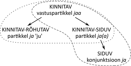Uurides sidesõna ja kujunemist, tuvastasime selle eelastmena kinnitava vastuspartikli jaa (ka jah) kasutuse ning sidesõna kujunemise kõrval (inter)subjektiivse kinnitava-rõhutava partikli ’ju, ometi’ eristumise (vt joonist 3):