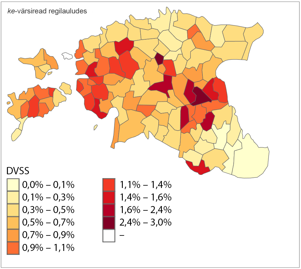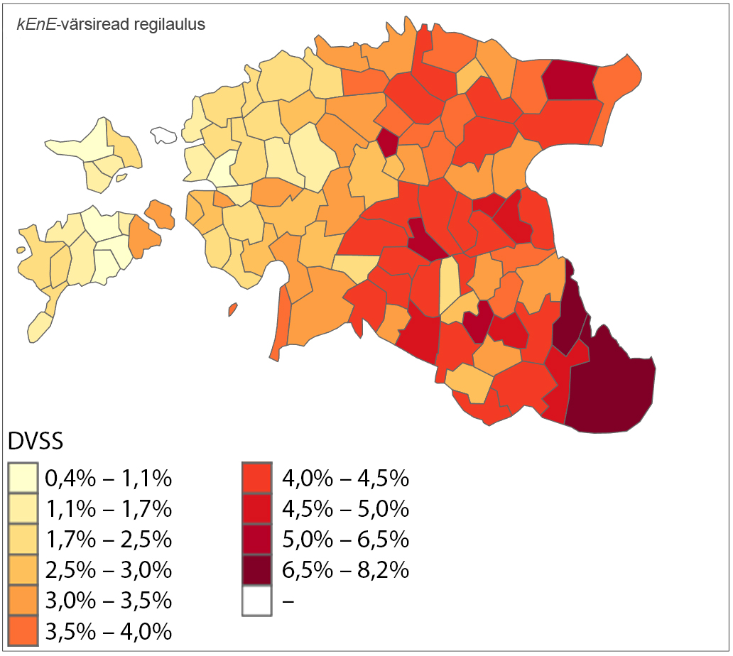 Piirkondlike mustrite täpsemaks väljaselgitamiseks jagasin Eesti alad geograafiliste koordinaatide mediaanide järgi neljaks: lääne- ja idapoolseteks ning põhja- ja lõunapoolseteks piirkondadeks. Selle jaotuse põhjal tehtud analüüs (joonis 3) näitas, et –kEnE DVSS on suurem Eesti ida- ja lõunaosas, kuigi ka mediaanist veidi põhja pool leidub kõrge DVSS-iga kihelkondi (nt Palamuse ja Maarja-Magdaleena) ning lõunas madalama DVSS-iga alasid (Hargla, Karula). Statistiliselt oluline on ida- ja läänepiirkondade erinevus (p < 0,001). Põhja- ja lõunapiirkondade erinevused –kEnE kasutamises on piiripealse olulisusega (p = 0,05).