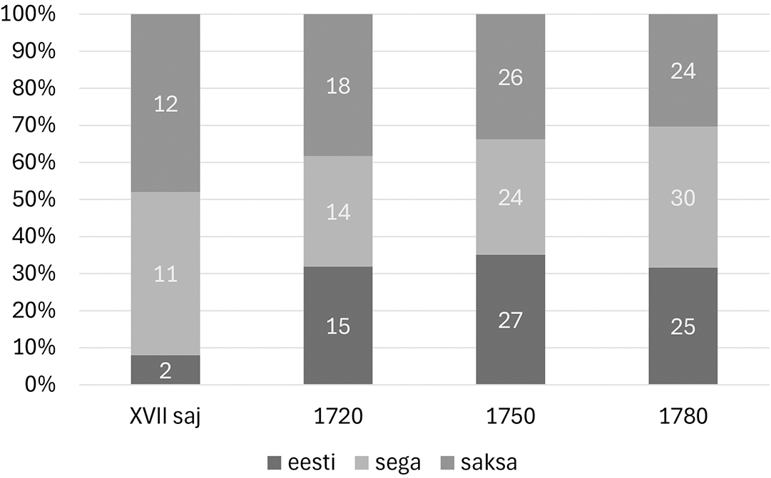 5 Etnilise päritolu ja sotsiaalse staatuse seostamise küsitavuste kohta meetrikaraamatutes kirja pandud nimekuju põhjal alama keskklassi (käsitööliste, mõisateenijate ja ametimeeste) korral vt Põltsam-Jürjo, Ross 2025 ning seal viidatud Linnus 1979. Siinses käsitluses sellele aspektile tähelepanu pole pööratud ning üldiselt eestikeelses meetrikas saksapärase nimega saksa keeles sisse kantud keskklassi esindaja on loetud sakslaseks.