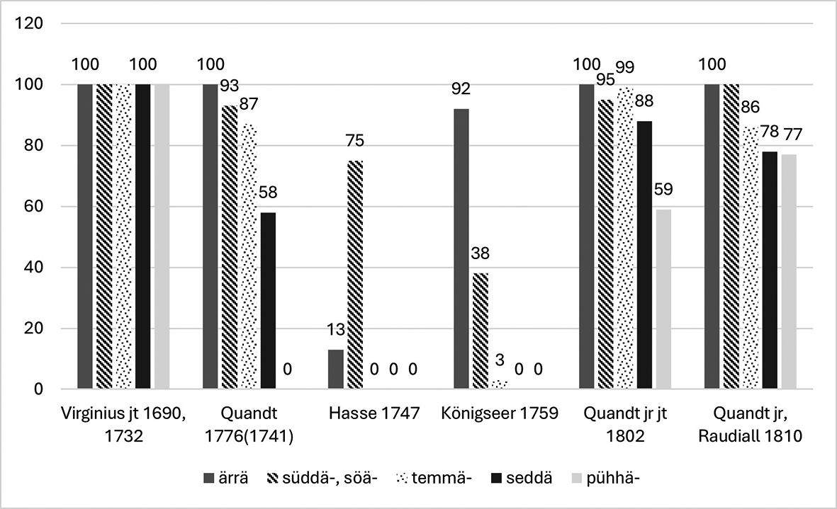 Võru murdele iseloomulik ä-vokaalharmoonia (Keem, Käsi 2002: 34) esines kõigis lõunaeesti tekstides, kuid varieerus seal nii sõnuti kui ka raamatuti palju. Palju sõnu tulid samas tekstiski ette kord a-lisel, kord ä-lisel kujul. Virginiuse jt lauluraamatu mõlemas trükis oli ä-lisi kujusid kõige enam (nt sõna önnisteggija oli ä-line vaid neil), Quandti lauluraamatus juba vähem. Eriti vähe oli neid Hassel, pisut enam Königseeril ja taas rohkem Quandt jr jt lauluraamatutes, jõudmata siiski enam Virginiuse jt lauluraamatu tasemeni. See üldine pilt avaldus ka sagedaimate ä ~ a varieeruvusega sõnade puhul, mis Virginiuse jt lauluraamatus esinesid üksnes ä-listel kujudel temmä-, pühhä-, südda– ~ söä-, ärrä ja seddä (vt joonist 1). Quandti lauluraamatus esines neist vaid ärrä jäägitult ä-lisena, pühha-tüvi seevastu hoopis täiesti a-lisena ning ülejäänud sõna(vormi)de ä-liste kasutuste osakaal oli üle poole. Hassel ja Königseeril domineeris pea kõigi sõnade puhul a-line kuju, ä-list kuju eelistas Hasse vaid süddä– ja Königseer ärrä-tüvest. Quandt noorema eestvõttel valminud lauluraamatutes soositi taas ä-lisi kujusid, kuid nende osakaal ei küündinud enam päris Virginiuse jt lauluraamatu omani.