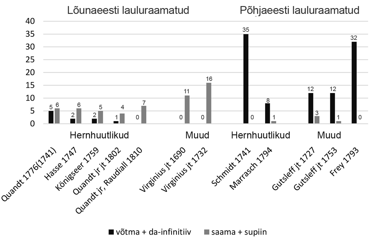 Saama-tuleviku puhul võis samuti märgata senistes kirjakeeltes kehtinud tava kestmist (vt joonist 2). Anton Thor Helle oli põhjaeestikeelset täispiiblit redigeerides usinalt saama-tulevikku välja ja võtma-tarindit sisse toimetanud (Kilgi 2012: 27–30), lõunaeesti kirjakeeles sellist muudatust ei tehtud (Ross 2013). Seetõttu pole üllatav, et lõunaeesti tekstides kasutati meelsasti tarindit /saama + supiin/, samas kui põhjaeesti tekstides kasutati seda märksa harvem ja eelistati tulevikulisust väljendada muul moel, sh võtma-tarindiga. Hernhuutlikes lauluraamatutes esines siiski mõnevõrra vähem saama-tulevikku ja mõnevõrra rohkem võtma-tarindit kui Virginiuse jt omas. Võtma-tarindit kasutasid eriti hoogsalt Schmidt ja Frey, kelle lauludes esines seda tulevikulises funktsioonis veel mitu korda enam kui Helle enda osalusel valminud lauluraamatus (Gutsleff jt 1727, 1753), nt Oh kes wottab minno süddant Surma ihhust peästada! (Schmidt 1741: 318) ja senniks kui siin ellan ma, wöttan truist’ kannatada, ja so peäle häddas wata (Frey 1793: 60). Ei Schmidt ega Frey kasutanud kordagi saama-futuurumit.