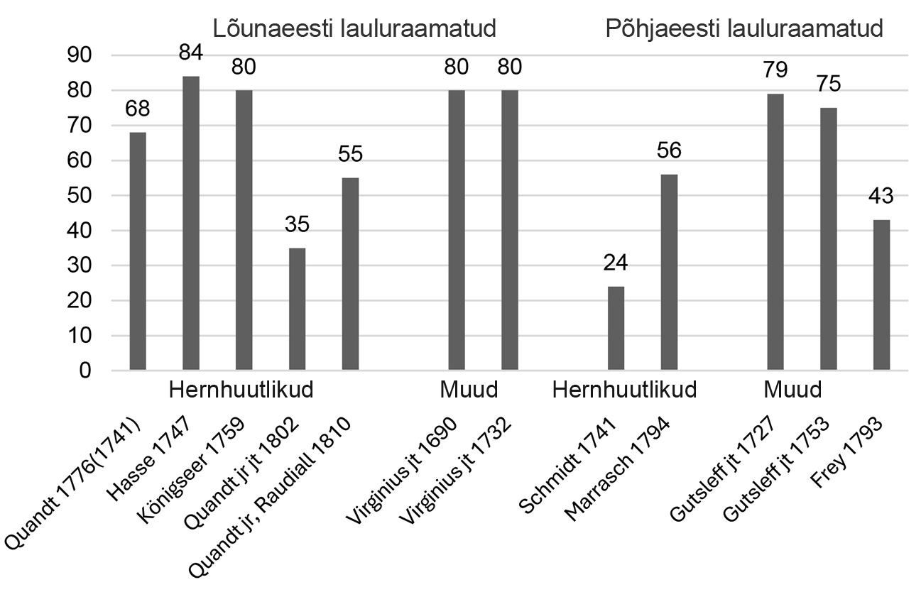 Valisin uurimiseks viis lõunaeestikeelset hernhuutlikku lauluraamatut (Quandt 1776 [1741]; Hasse 1747; Königseer 1759; Quandt jr jt 1802; Quandt jr, Raudiall 1810) ning kaks põhjaeestikeelset (Schmidt 1741; Marrasch 1794). Selgitamaks välja, kas need erinevad keeleliselt kiriku ametlikest lauluraamatutest, vaatasin lõunaeesti kirjakeelset Virginiuse jt lauluraamatu teist ja neljandat trükki (Virginius jt 1690, 1732) ning põhjaeesti kirjakeelset pietistide lauluraamatu teist ja kümnendat trükki (Gutsleff jt 1727, 1753) ja üht uut luterlikku ortodoksiat esindavat tõlget (Frey 1793). Igast raamatust vaatlesin viietuhandesõnalist katkendit: esmalt laule Kristuse kannatustest ja lisaks nii palju teksti, et kokku tuleks 5000 sõna. Neis katkendites jälgisin korpuspäringusüsteemi Sketch Engine (vt Kilgarriff jt 2014) toel, millised foneetilised, vormimoodustuslikud ja leksikaalsed erinevused ilmnevad kõige sagedamate sõnade kasutuses. Lisaks vaatasin, kuidas kajastuvad selles materjalis mõningad varasemas kirjakeeles täheldatud morfosüntaktilised jooned.