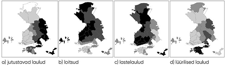 J o o n i s 1. Eri laululiikidesse kuuluvate tekstide osakaalu varieeruvus piirkonniti (Kallio jt 2024: 206–207). Tumedam toon tähistab liiki kuuluvate tekstide suuremat osakaalu.
