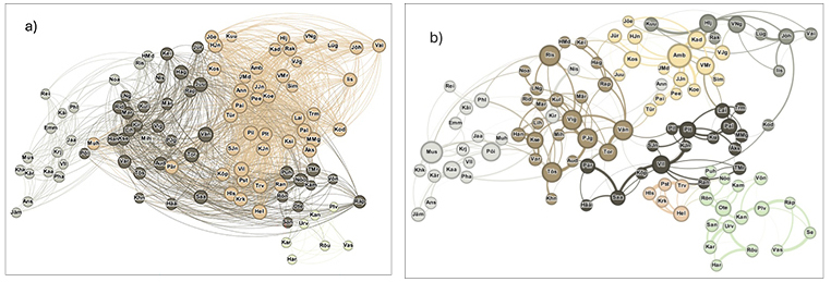J o o n i s 2. a) Regilaulualad värsimõõdu tunnuste järgi (Sarv 2019: 108); b) Regilaulualad kihelkondlike lauluvaramute sagedasemate sõnavormide jaotuste sarnasuse järgi (Sarv, Järv 2023: 246).