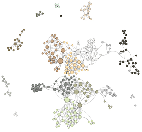 J o o n i s 3. Läänemaa laulikute võrgustik nende värsirepertuaari sarnasuse alusel. Laulikut esindav sõõr on seda suurem, mida rohkemate teiste laulikutega tema repertuaaris sarnaseid värsse on. Laulikute paigutus graafikul lähtub nende värsirepertuaari sarnasusest. Samasse kihelkonda kuuluvad laulikud on kuvatud sama varjundiga ning nad moodustavad võrdlemisi selgelt eristuvaid gruppe. Mõned mitmes kihelkonnas elanud laulikud on omandanud kahe kihelkonna värsirepertuaari. Graafiku äärealadel on väiksema lauluvaraga Hiiumaa kihelkondade laulikud ning mõni väiksema või eripärase repertuaariga laulik.